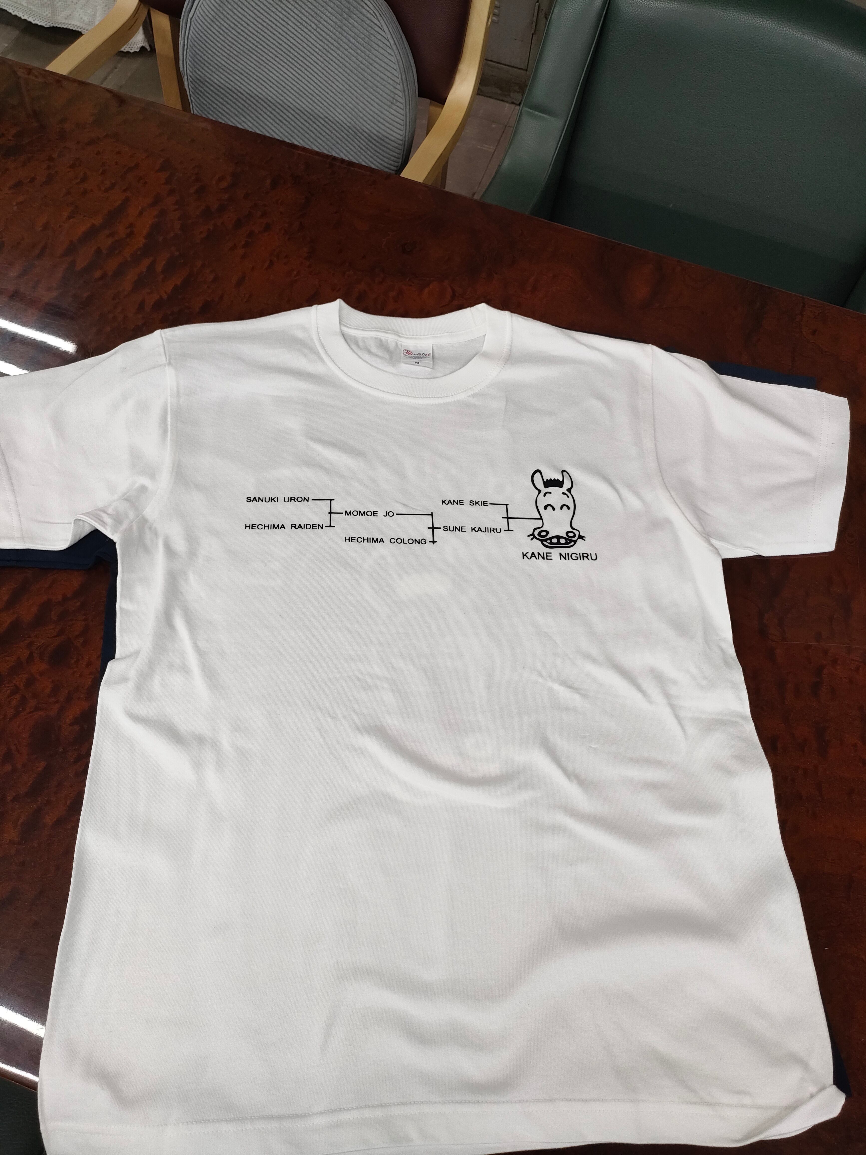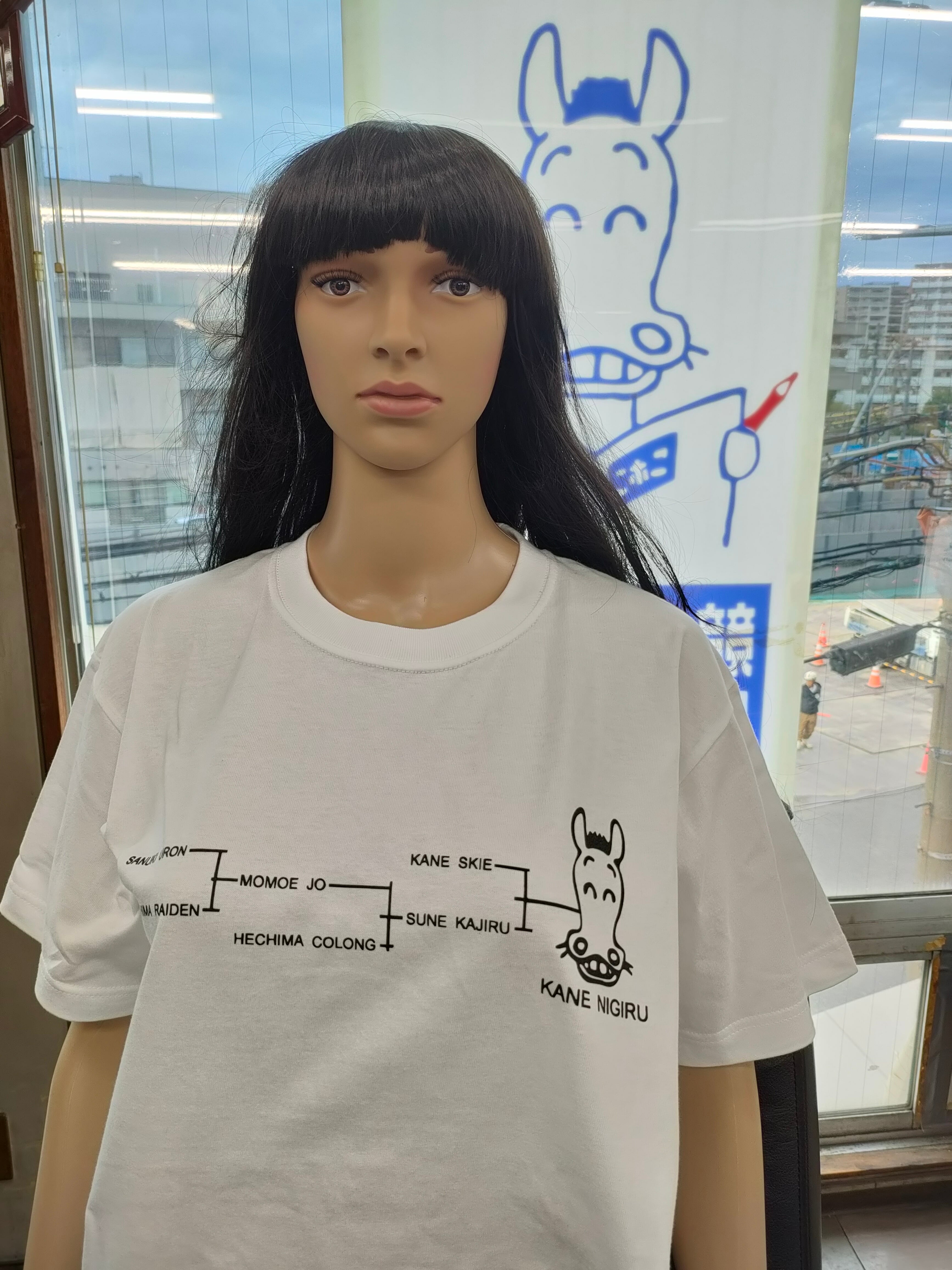 競馬ニホンのマスコットキャラクター、カネニギルの血統図を白いTシャツにプリントしました